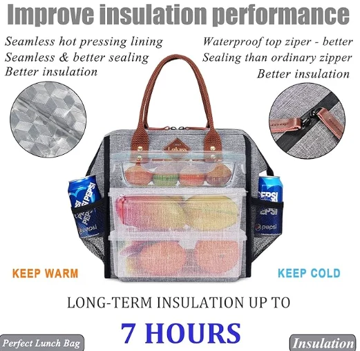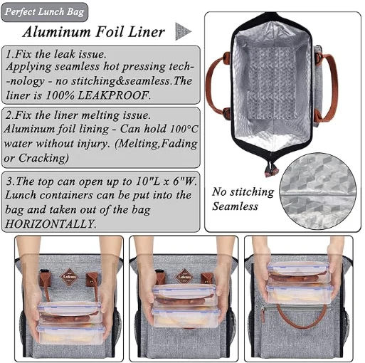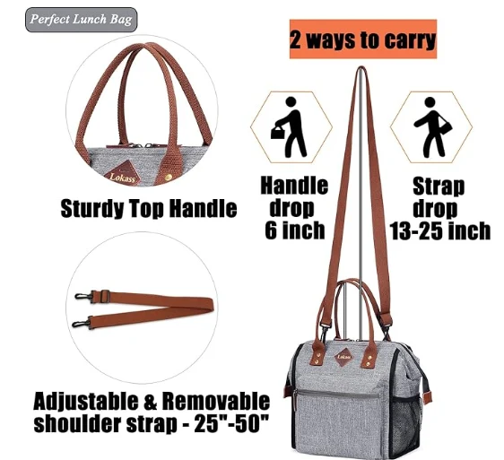 Large lunch bag has a main compartment(10.5"x6"x12"), a big front zipper pocket (8"x7"x1.5"), a back pocket (9.5"x6.5") and 2 side mesh pockets. د اسانه ایښودلو وړ او د مینځلو وړ تړلو وړ او د ساتلو وړ اوږه پټه پټول (25 "-50") د اسانه کیر لپاره ډیزاین.