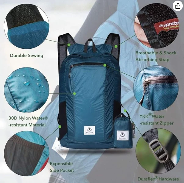 د اوبو ضد سپک جلدد بیکپیک، دا د سپک وزن لرونکي ورځپیک د اوبو مقاومت لرونکي موادو او زپپر څخه جوړ شوی دی. په مؤثره توګه د باران اوبو څخه مخنیوی د تلیفون یا نغدي او نورو توکو څخه مخنیوی وکړئ په شا کې.